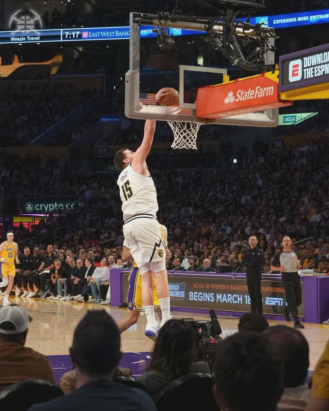 约基奇前三节砍下22+12+11,东契奇得到22+10+10,两人都拿到三双。第四节决战,掘金替补连续三分命中,末节最后5分钟,掘金领先6分。穆雷依然找不到准星,前13投仅1中。最后2分钟,穆雷对东契奇三分犯规,湖人追平!