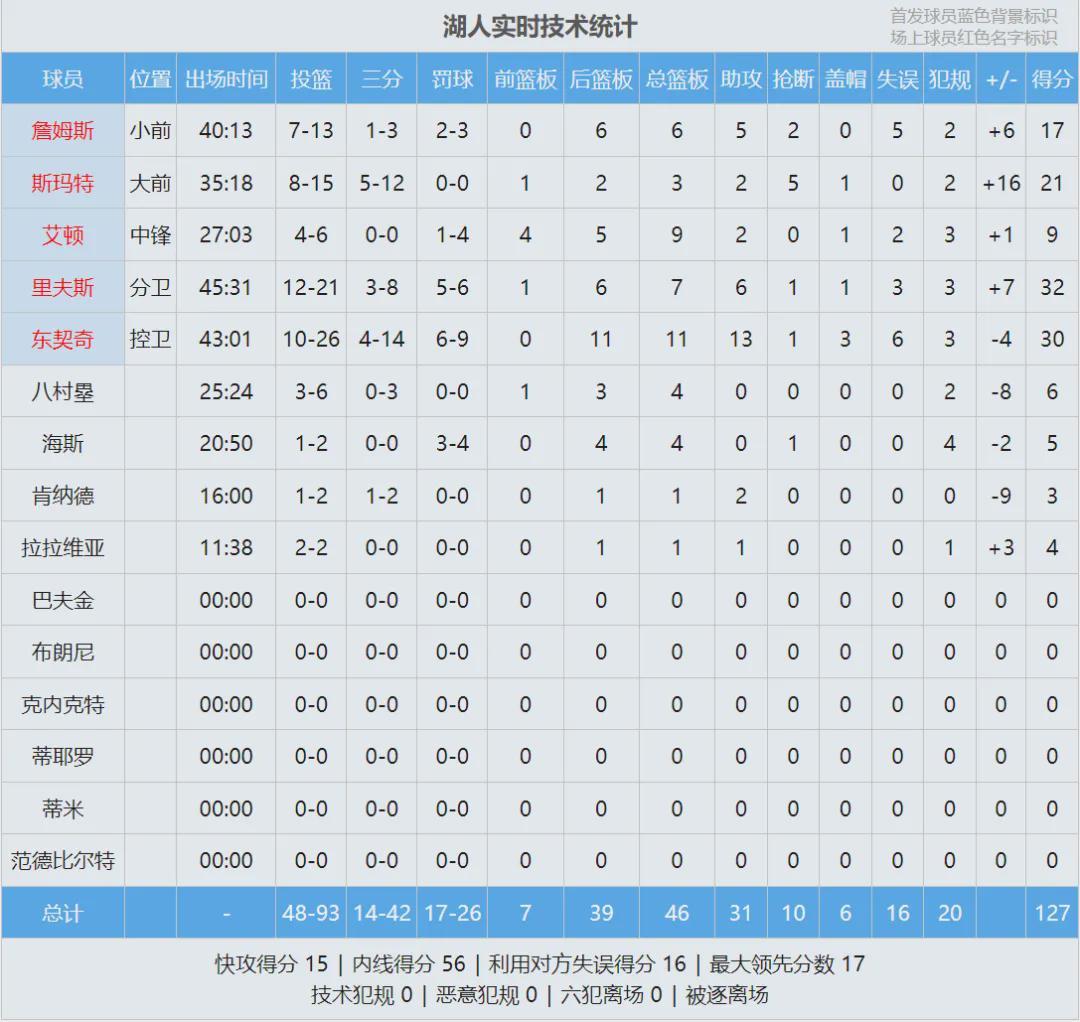 本赛季湖人和掘金交手3次,湖人2胜1负。最后看看数据: